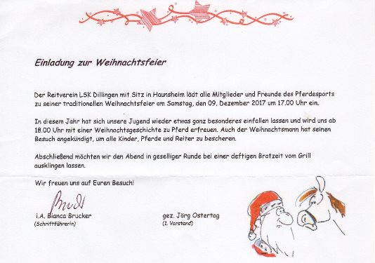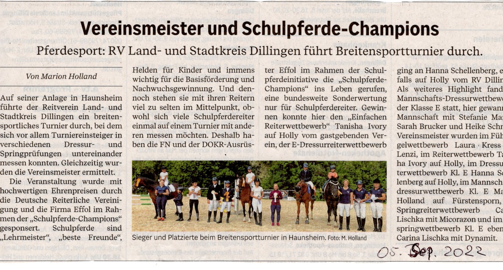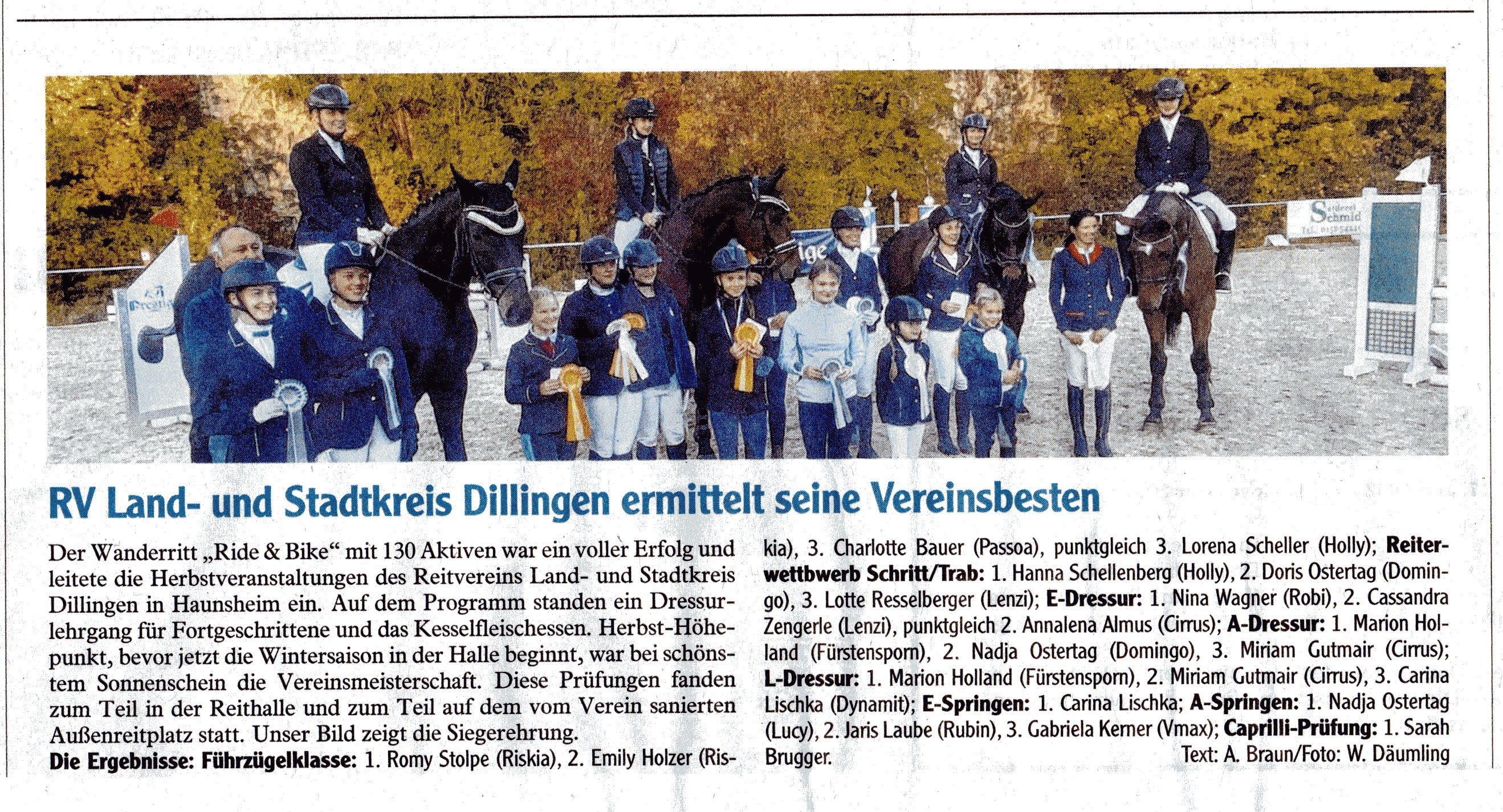 Wichtig: Wir machen bei unseren Veranstaltungen und Turnieren evtl Fotos und Videos. Diese möchten wir auch gerne in unserer Bildergalerie auf der Homepage zeigen. Sollten Sie dies nicht wünschen dann bitte gleich bei der Veranstaltiúng sagen, oder, wenn Sie ein gezeigtes Foto löschen lassen wollen, eine kurze Mail an: info@Reitverein-Dillingen.de.