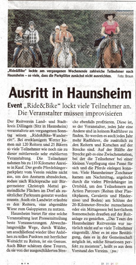Am Fronleichnamstag machten 17 Mitglieder des Haunsheimer Reitvereins beim alljährlichen Vereinsausflug einen Satteltausch. Die Pferdesättel blieben in der Sattelkammer und die Pferde durften den ganzen Tag auf die Koppel. Dafür kamen die Fahrräder aus der Garage und die Sättel der Fahrräder mussten eine 25 km lange Tour zur Charlottenhöhle und zurück aushalten.