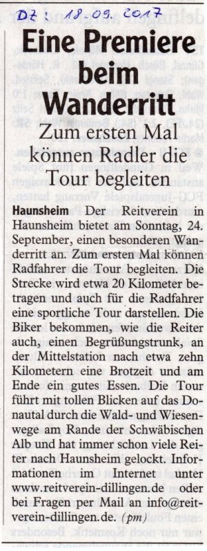 Ein voller Erfolg. 90 Starter und herrlichstes Wetter. Reiter, Fahrer und Radler gemeinsam auf der Strecke. Catering wie immer sehr schmackhaft. Die Geschicklichkeitsprüfung am Ende der Tour war toll vorbereitet. Anfeuerungen für die Teilnehmer kamen von allen Seiten. Danke an die vielen Leute die zum perfekten Gelingen beigetragen haben. 2018 hoffen wir auf ein Wiedersehen... Bilder demnächst in der Galerie.