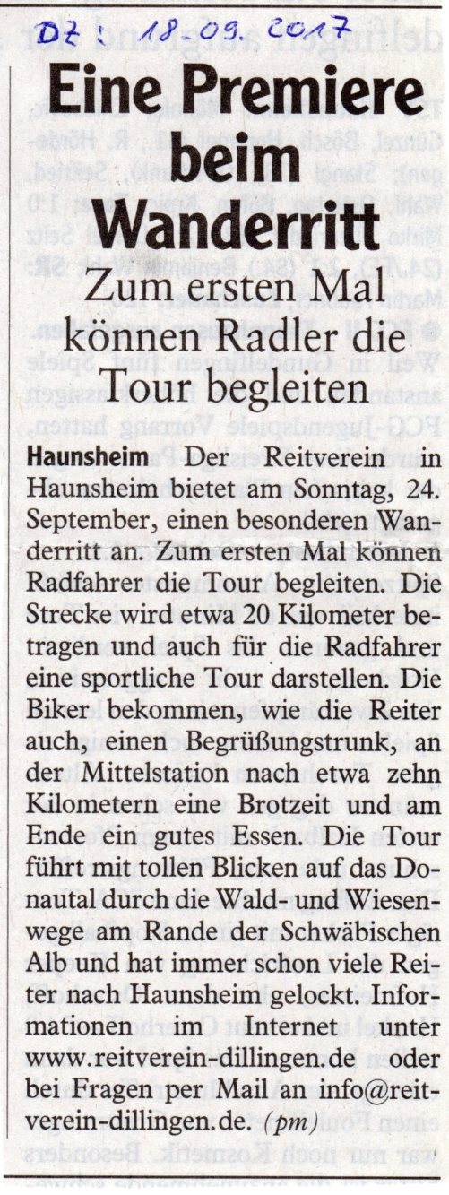 Und wieder ist ein Jahr vorbei. Wir freuen uns auf Euch. Am Rande der Schwäbischen Alb gibt es wieder tolle Wege und Punkte auf der Wanderrittstrecke, die jedes Jahr auf einer anderen Route verläuft. Unser Essen für Euch wird wie immer sehr schmackhaft sein. Die Geschicklichkeitsprüfung am Ende der Tour ist schon in Vorbereitung. Die Strecke ist gut ausgeschildert.